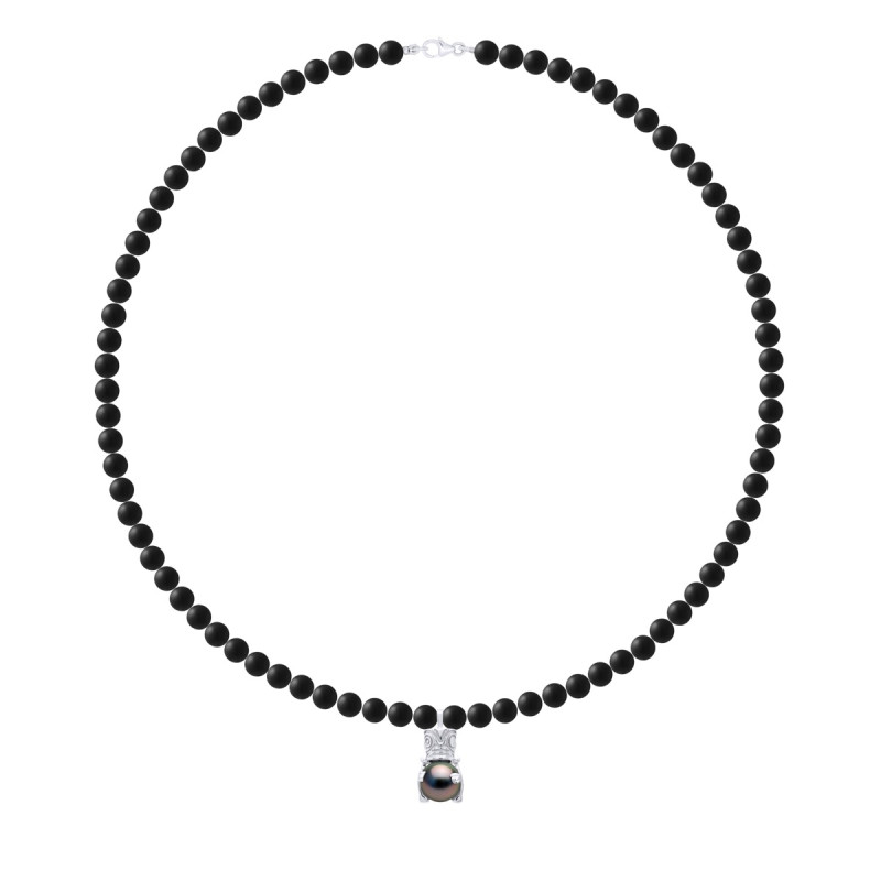 Collier AGATE NOIRE MATTE Ronde 6 mm avec Pendentif TIKI Perle de Tahiti Ronde 9-10 mm - Fermoir Mousqueton  - Argent 925 Millièmes - Longueur 50 cm - Livré avec Certificat d'Authenticité et de Garantie Internationale - MANUFACTURE DANS NOS ATELIERS Français